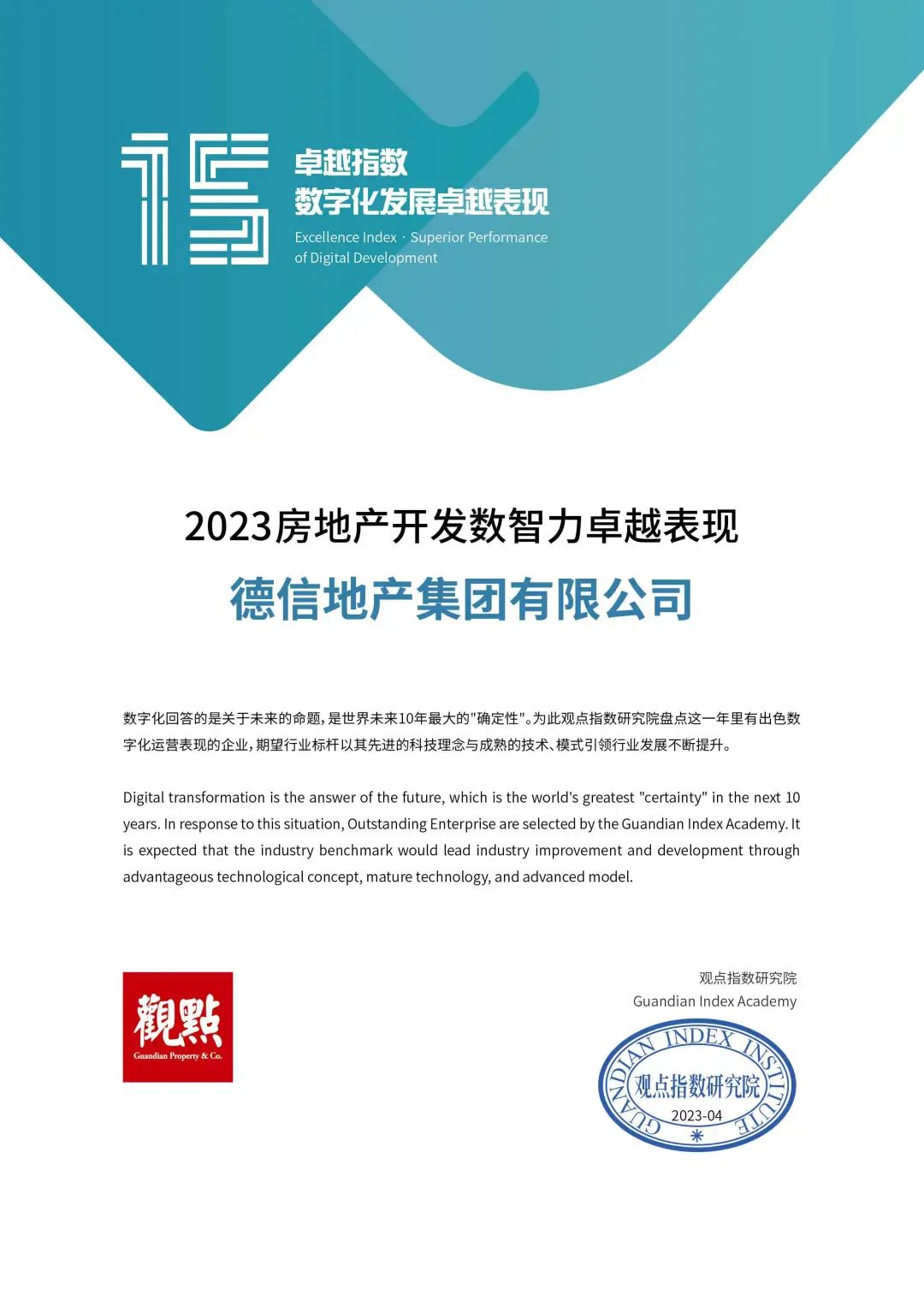 基于数字化运营,观点指数研究院选定地产行业及相关领域中数字化转型积极并具有一定成果的定量样本企业进行全面的调研,对数字化运营的覆盖情况、应用程度、发展痛点、应用场景、未来希冀方向等进行独立深度调查,独家发布 《卓越指数 • 2023 数字未来发展报告》。其中,德信地产以高质量的产品、高效的运营和营销数字化创新,荣获“2023房地产开发数智力卓越表现”奖项。